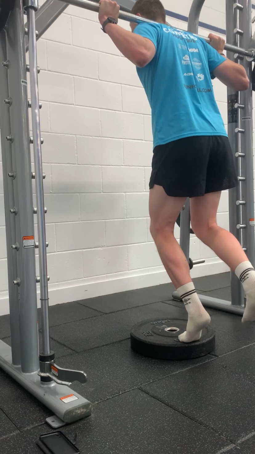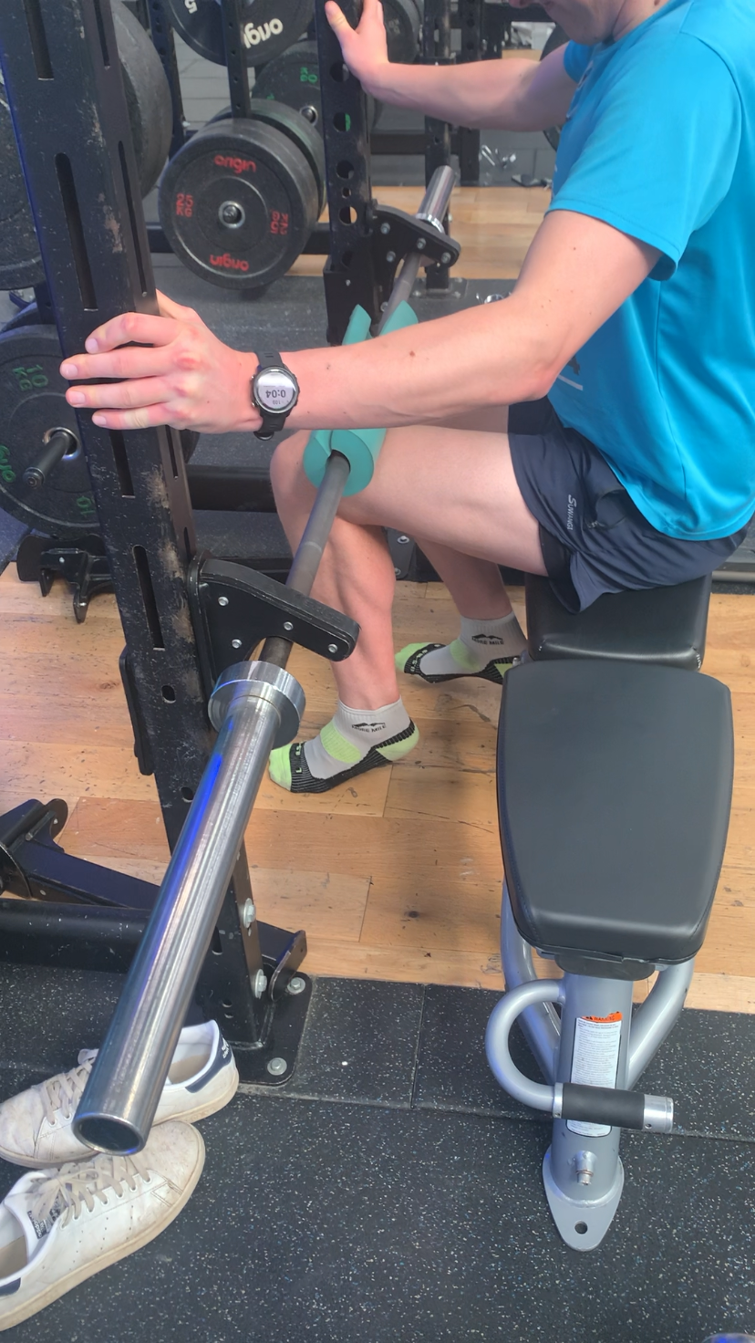 Single Leg Calf Raises – If you have an achilles or soleus tendinopathy these are your go to. These are best completed single leg so that you are still able to load your good leg to an appropriate level. To be able to do these isometrically it can be a good idea to turn the hooks on a squat rack upside down and push upwards against them with a barbell or use a smith machine. This way you are not dependent on your balance.