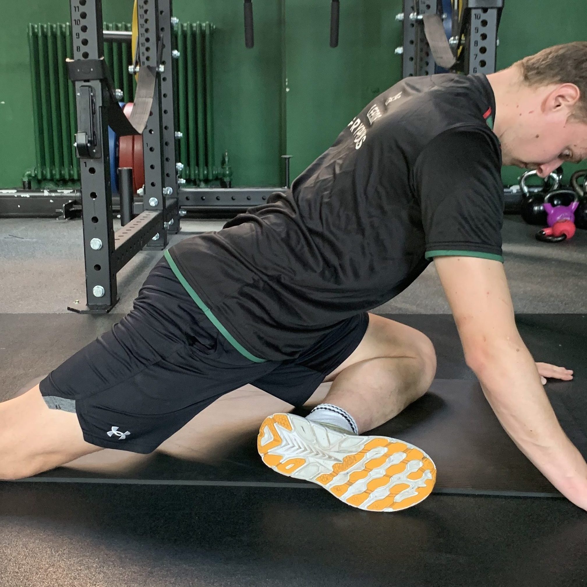 Pigeon stretch – Get yourself on to one knee but let the lead knee fall outwards towards the floor and lean your body forwards. Place your hands on the floor for support. To get the most out of the stretch, move your foot as far forwards while keeping the inside of your ankle pointing up.