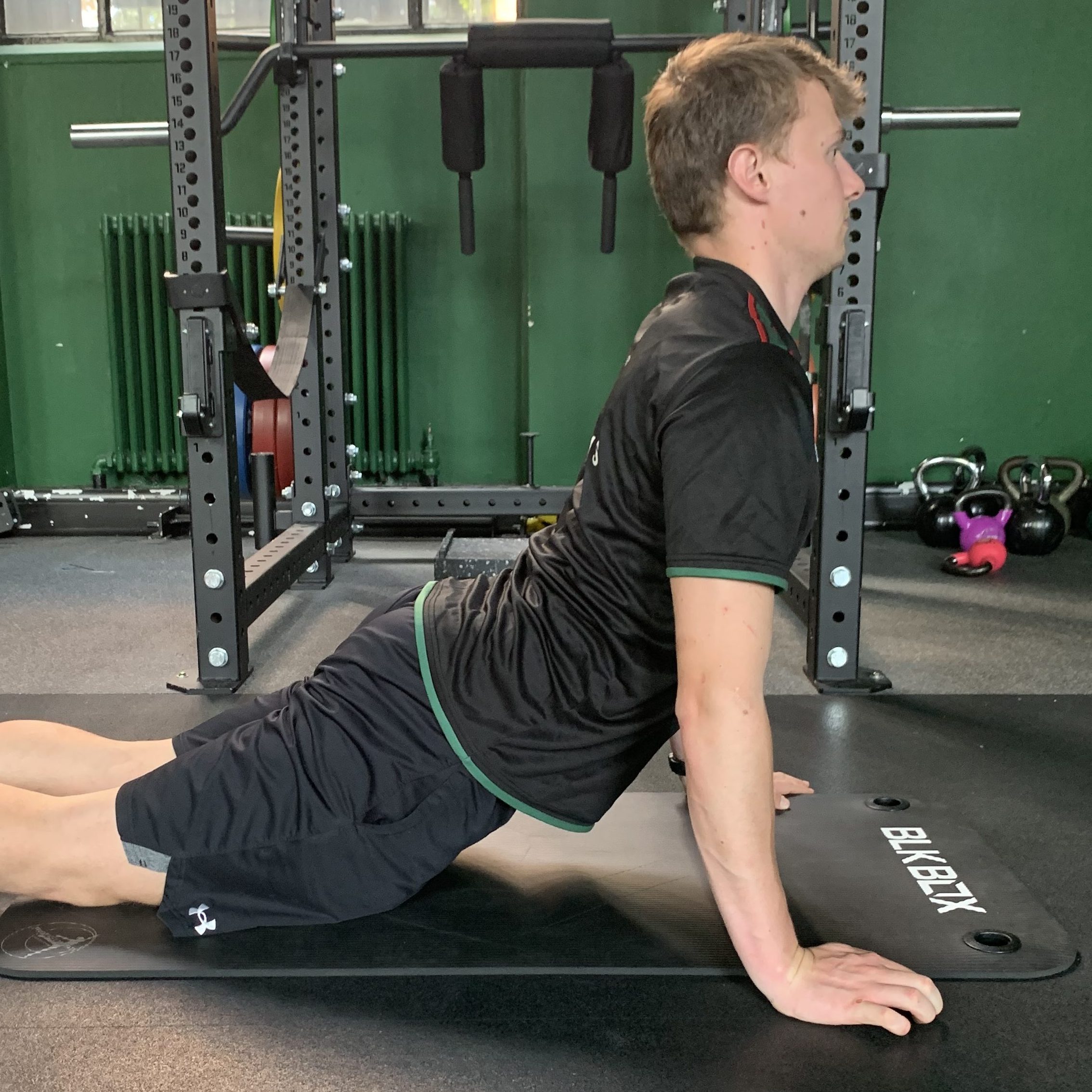 Cobra – Lay yourself on your front and lift your chest of the floor by pushing through your hands. Try to push yourbelly button forward whilst pulling you shoulder blades back.