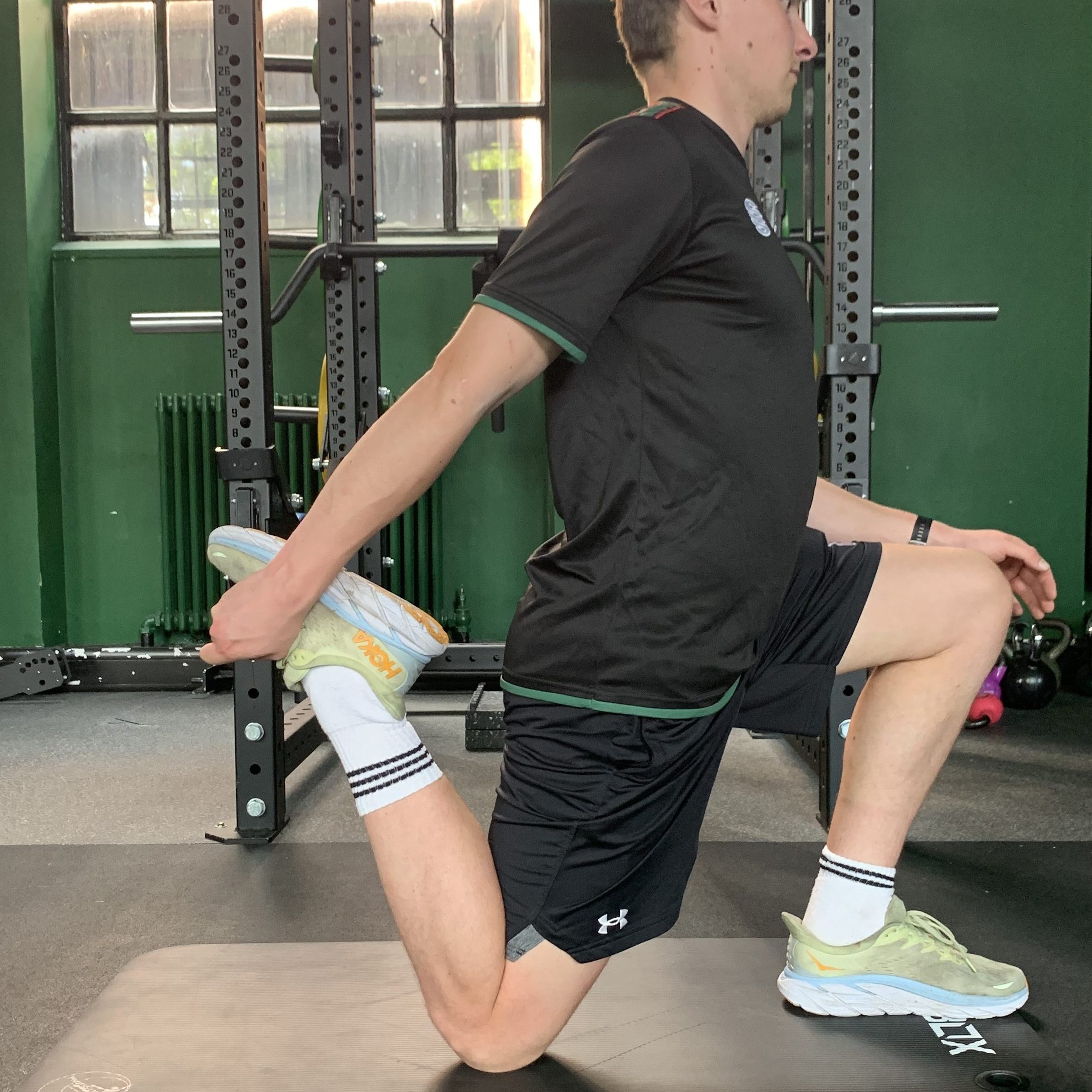 Couch Stretch – Get yourself onto one knee. Reach for the ankle of your trail leg and pull it up towards your bum. Squeeze your glutes for an extra stretch.