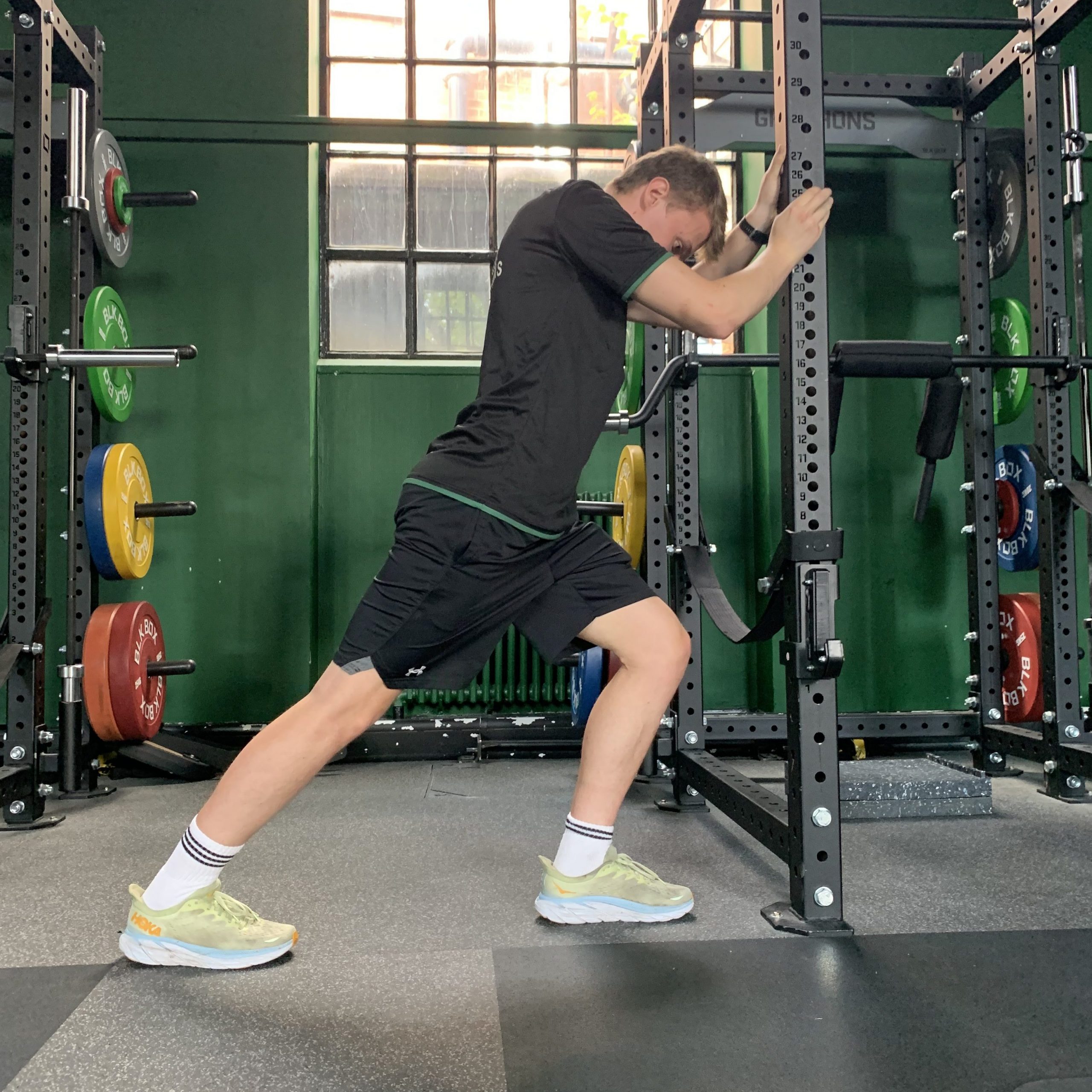 Calf Stretch – Find a stable object to lean on with your hands in front of you. Push one leg behind you as far as you can while keeping your heel on the ground. Use the other leg to support yourself